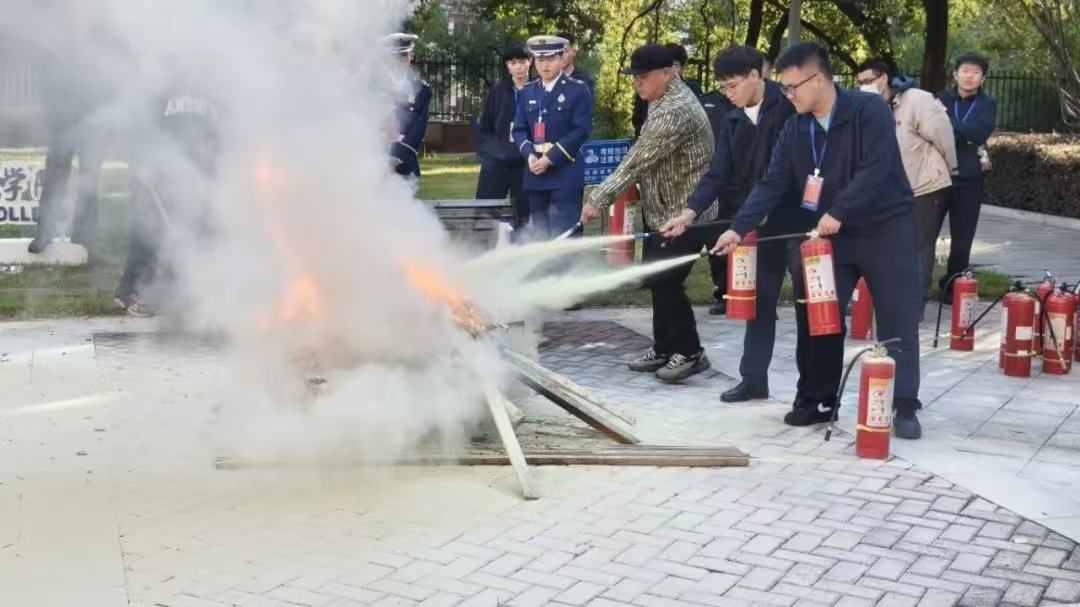在室外演练场,消防员现场讲解并演示干粉灭火器的正确使用方法与步骤。师生员工们在消防员的指导下,分批进行灭火实操。